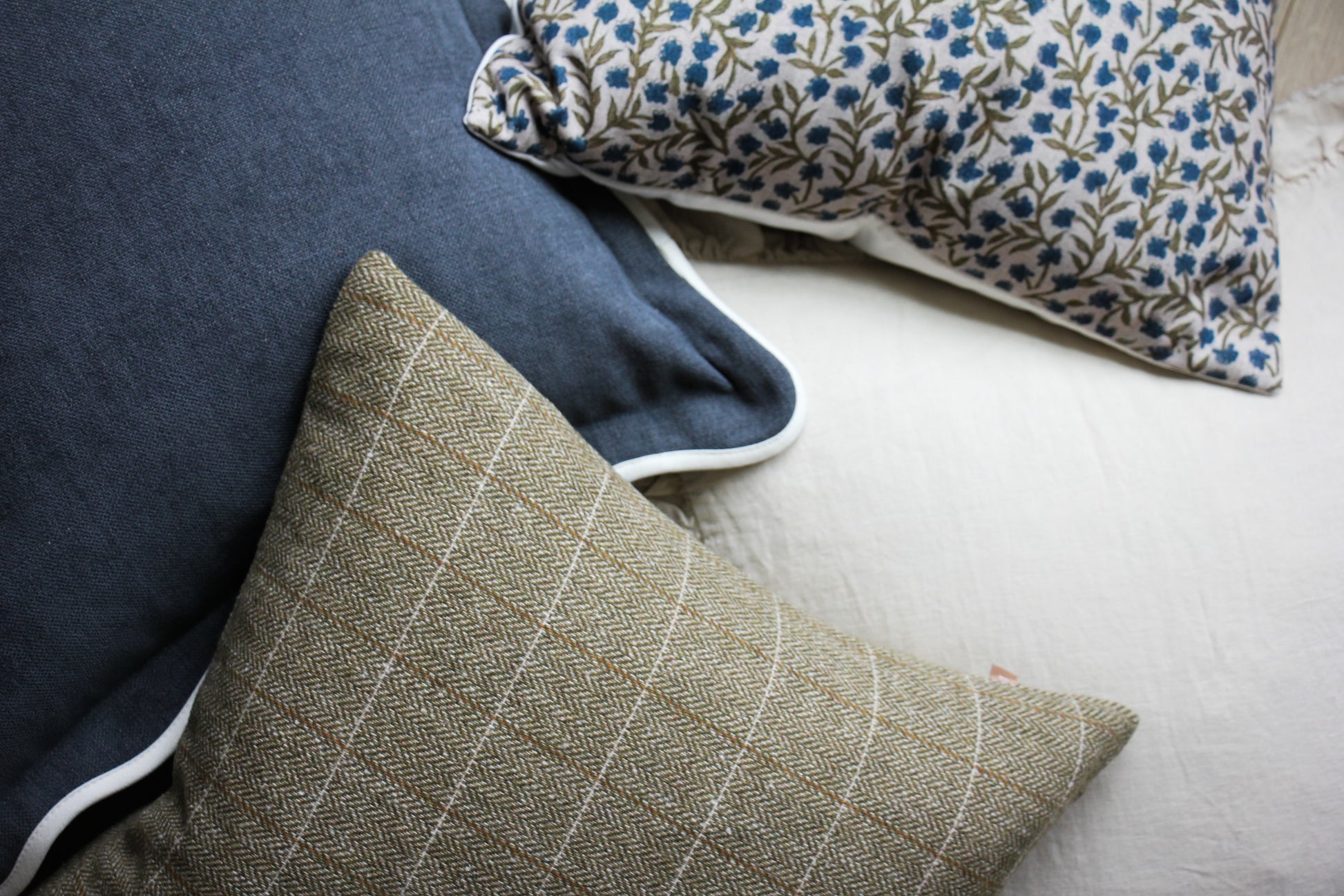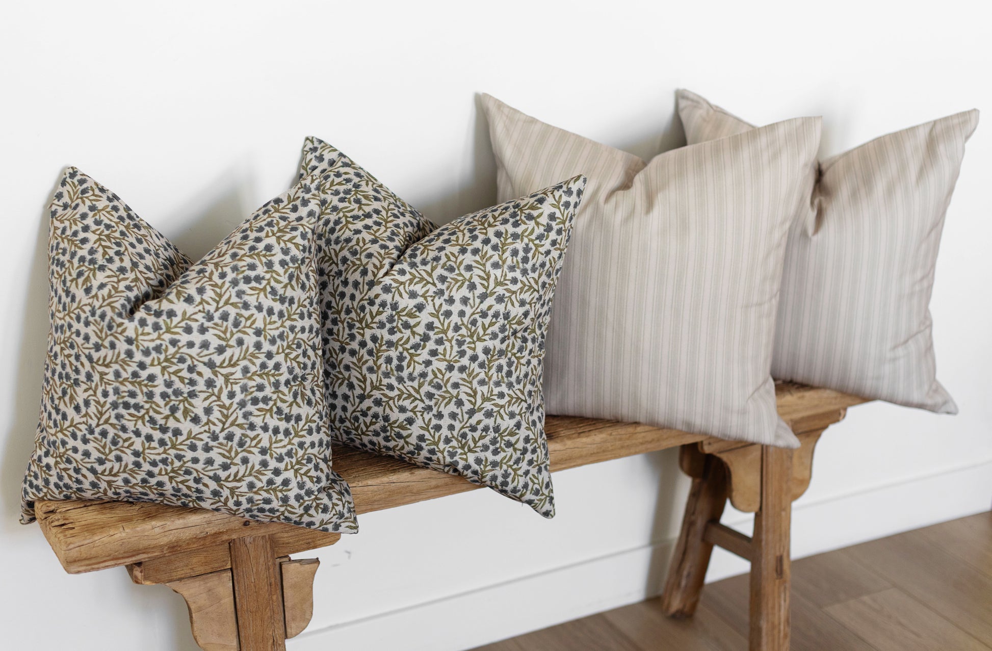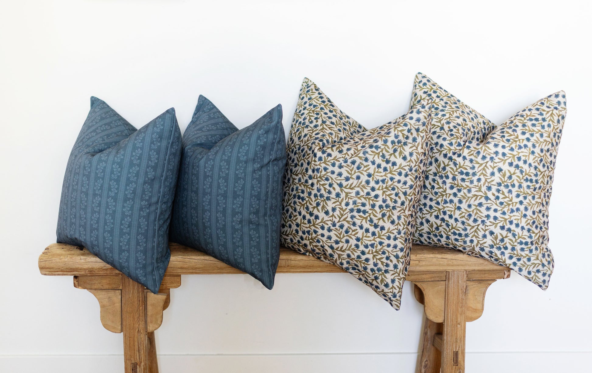 The Banbury Blue pillow features blue berries and green vines on a natural linen background. It’s lighthearted yet classic, pairing easily with a range of colors and textures. Double-sided pattern.