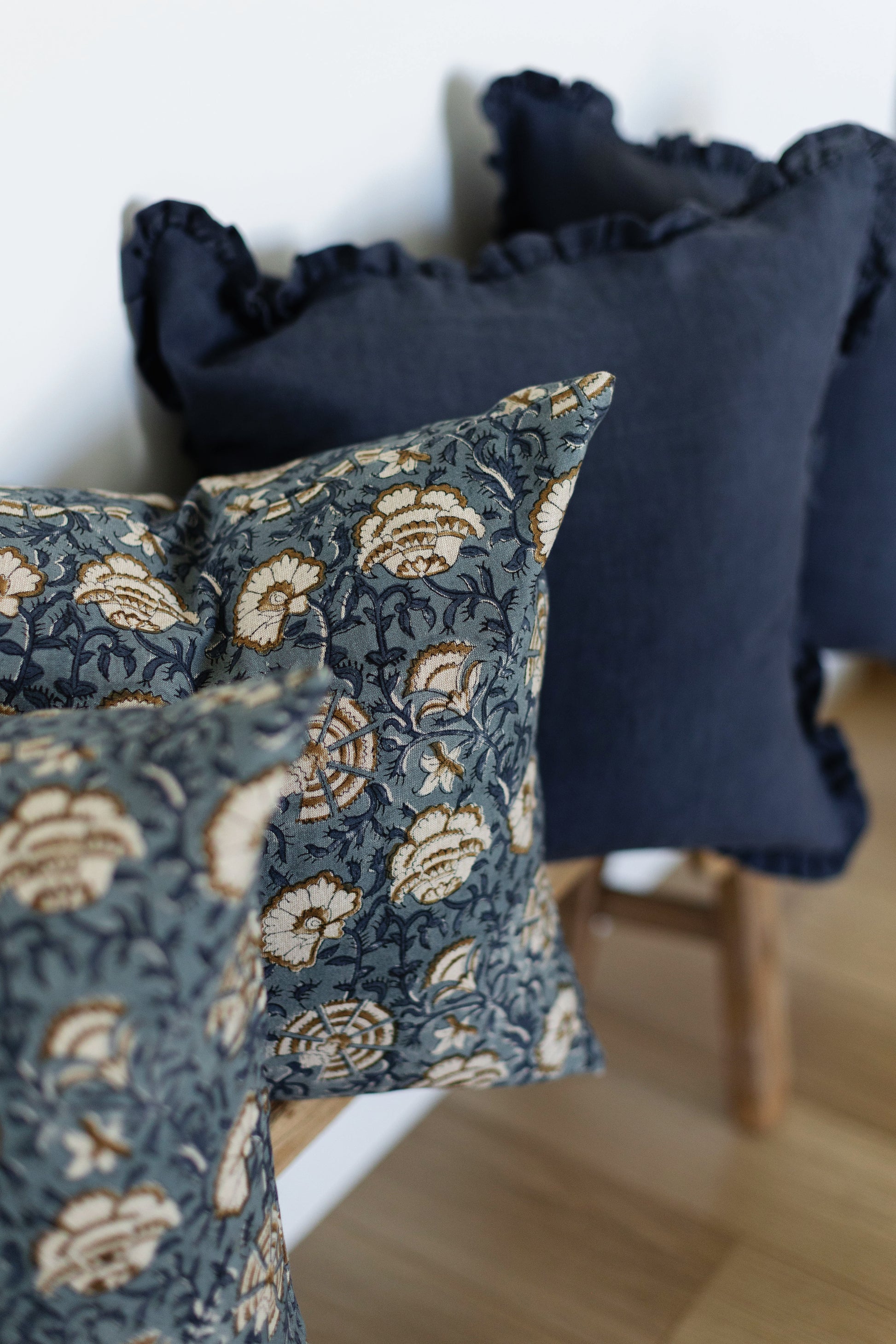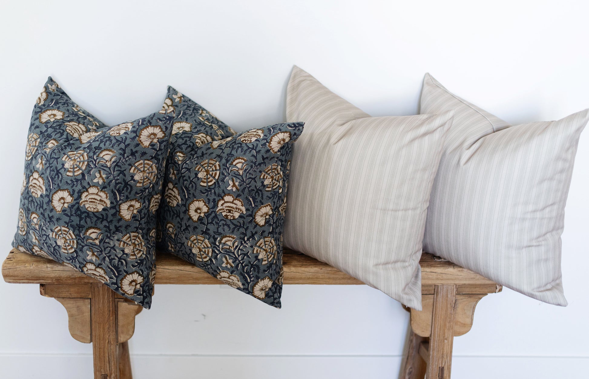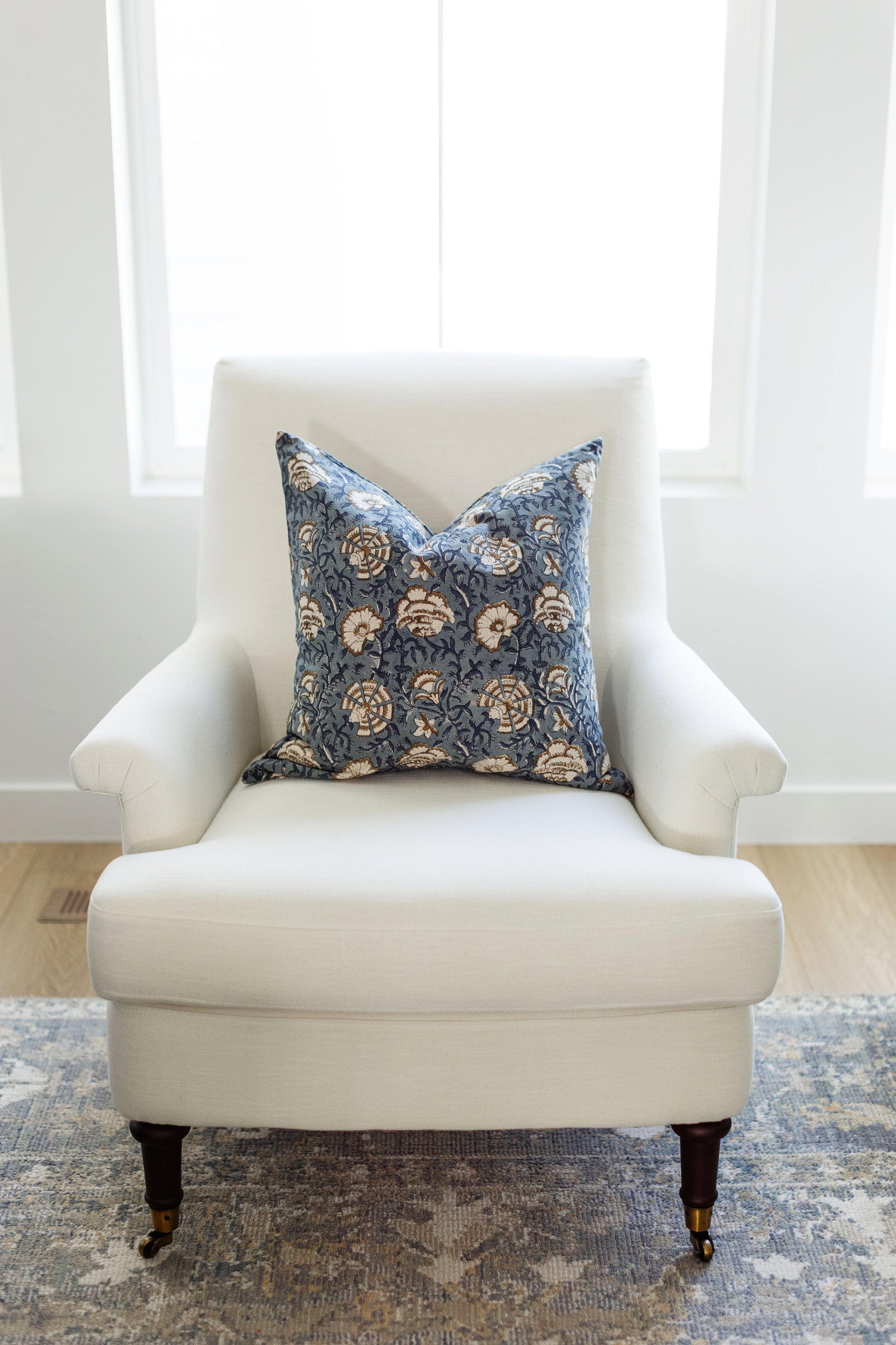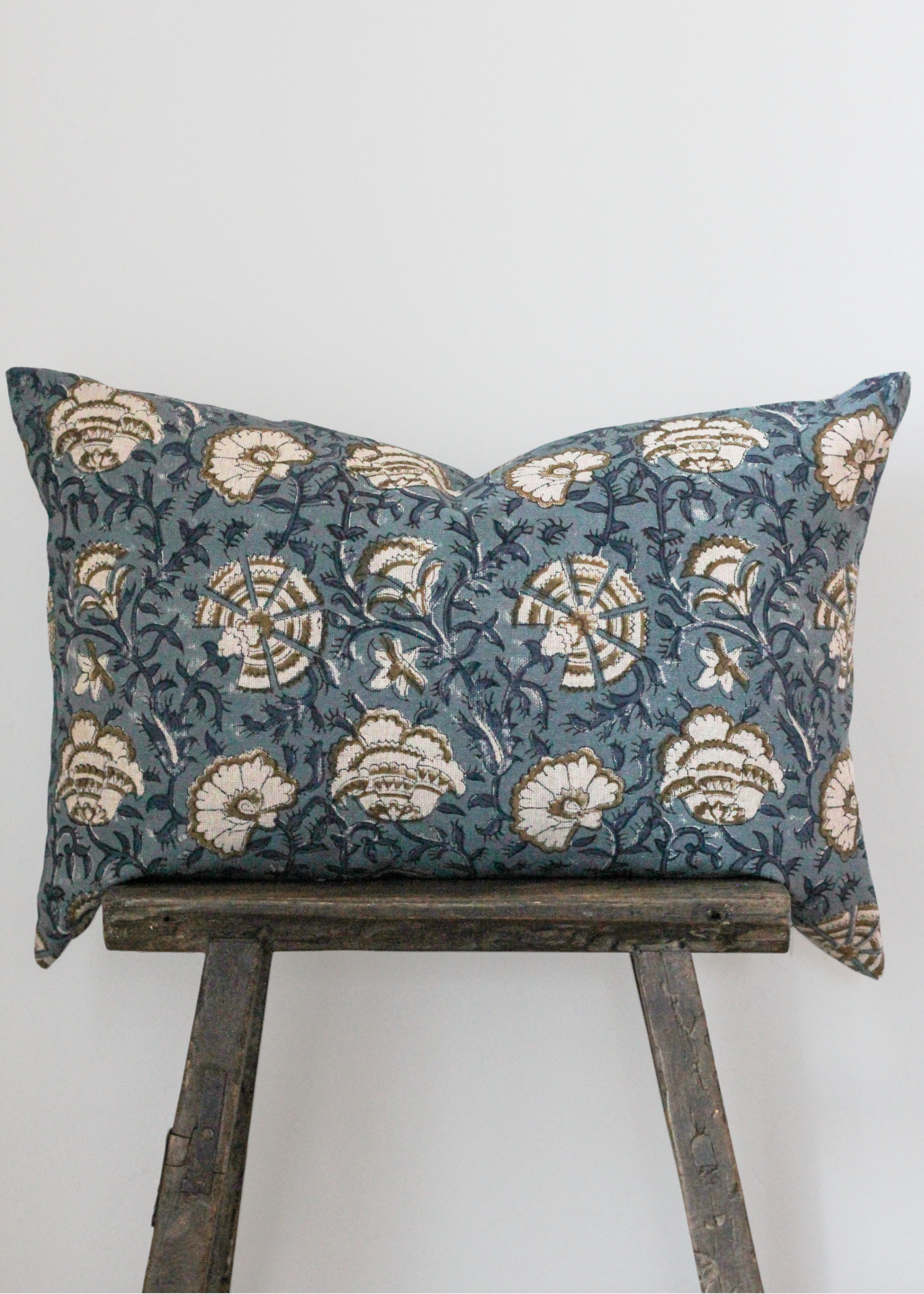 Hand block printed in India, the Cadiz pillow showcases a dusty blue floral pattern with white and brown details. Each one has unique character and timeless appeal. Double-sided pattern.