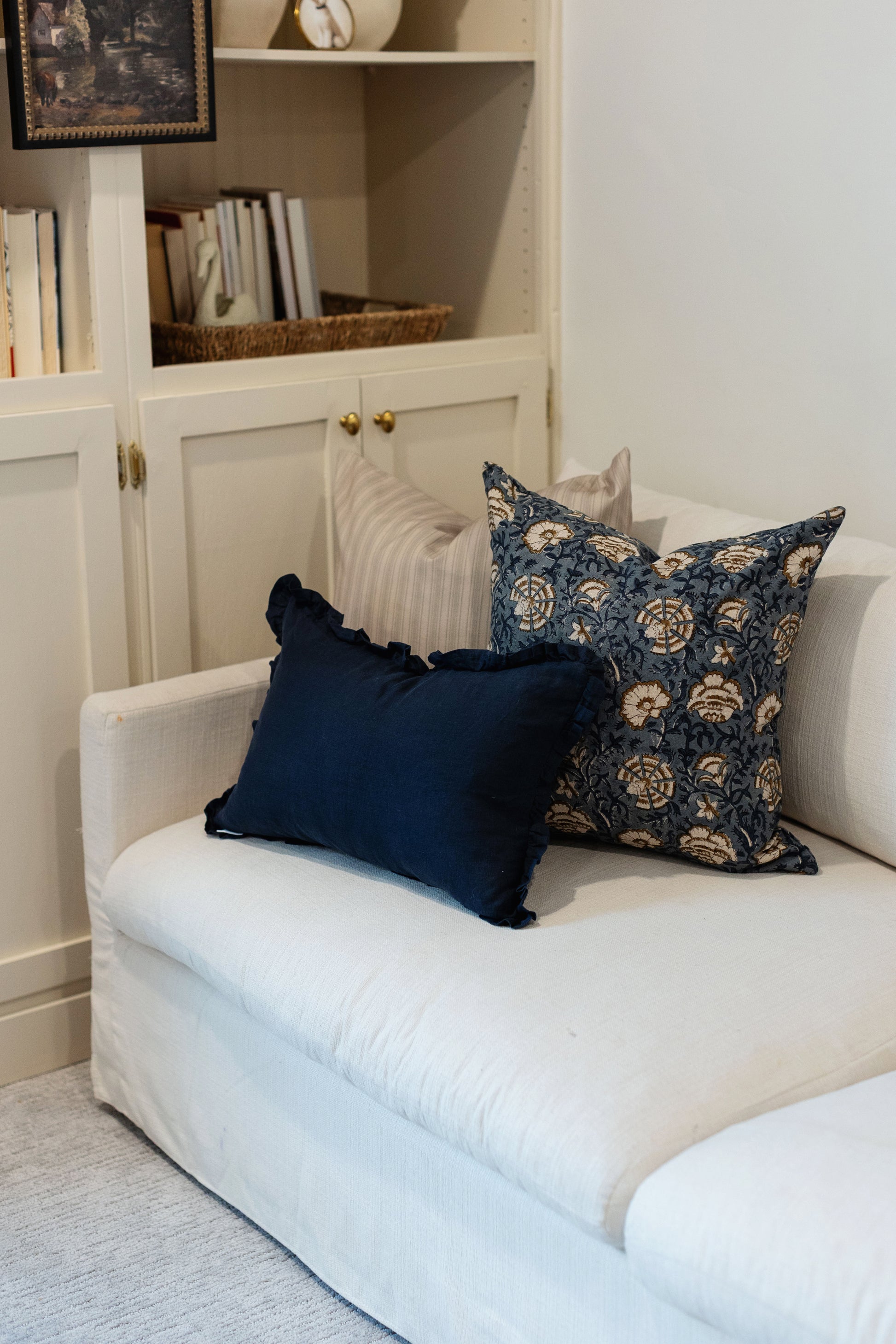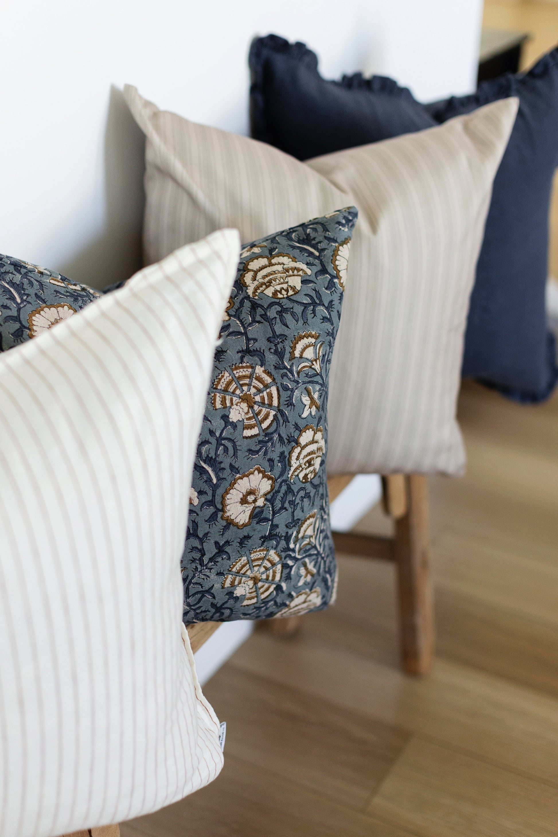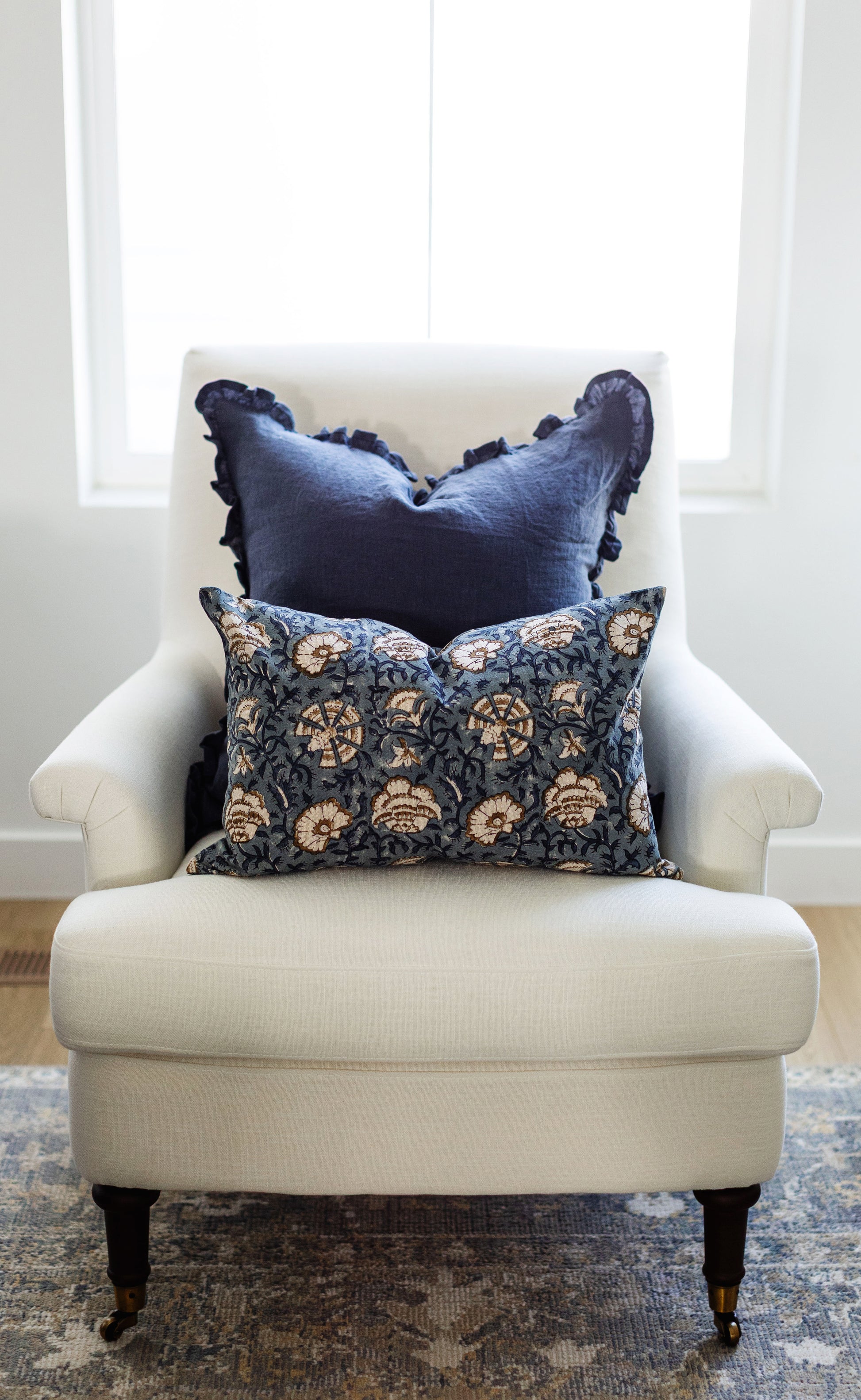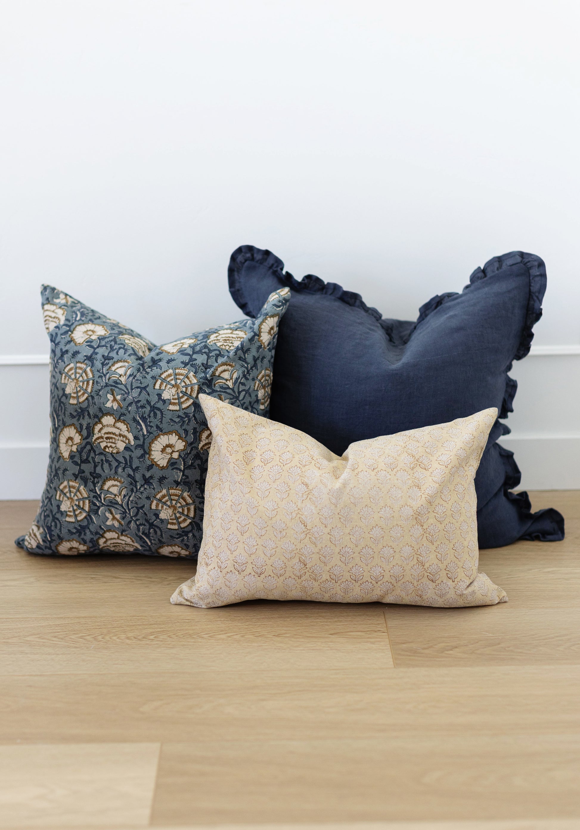 Hand block printed in India, the Cadiz pillow showcases a dusty blue floral pattern with white and brown details. Each one has unique character and timeless appeal. Double-sided pattern.