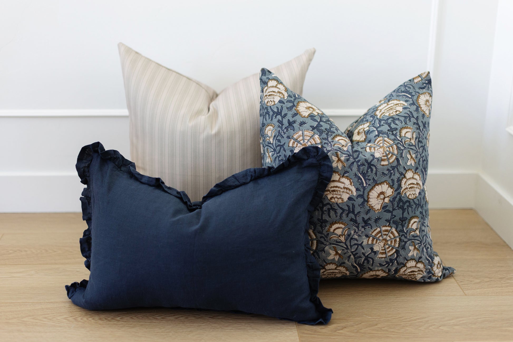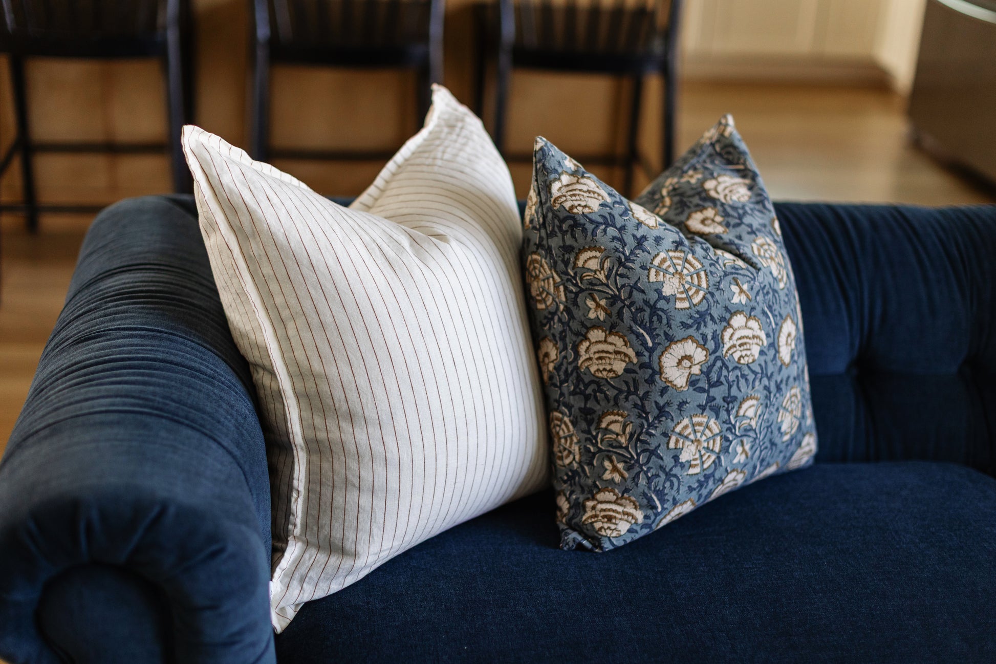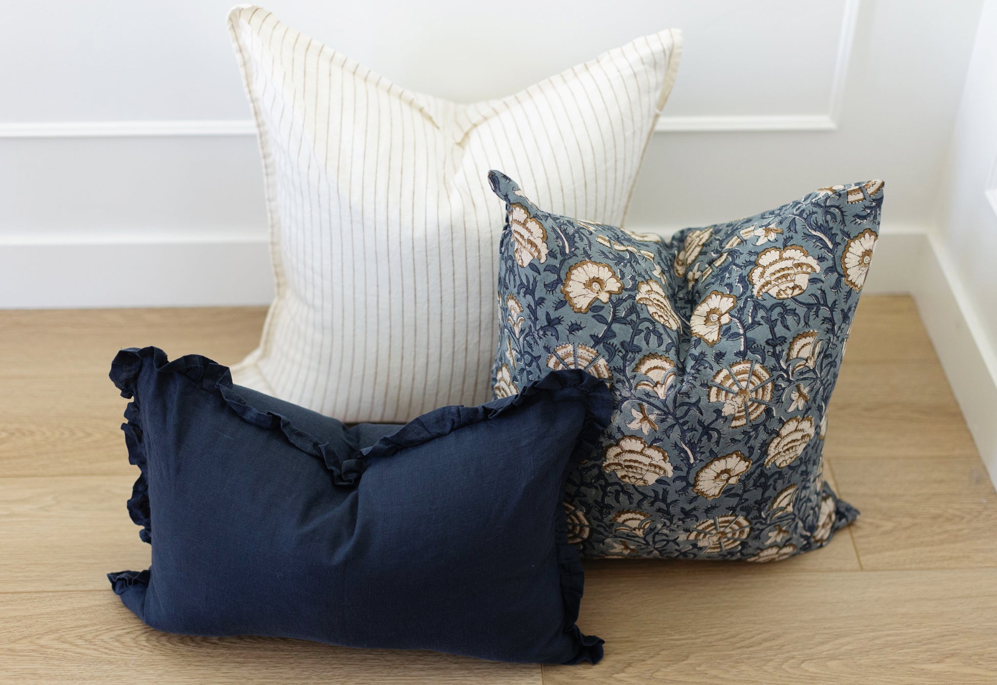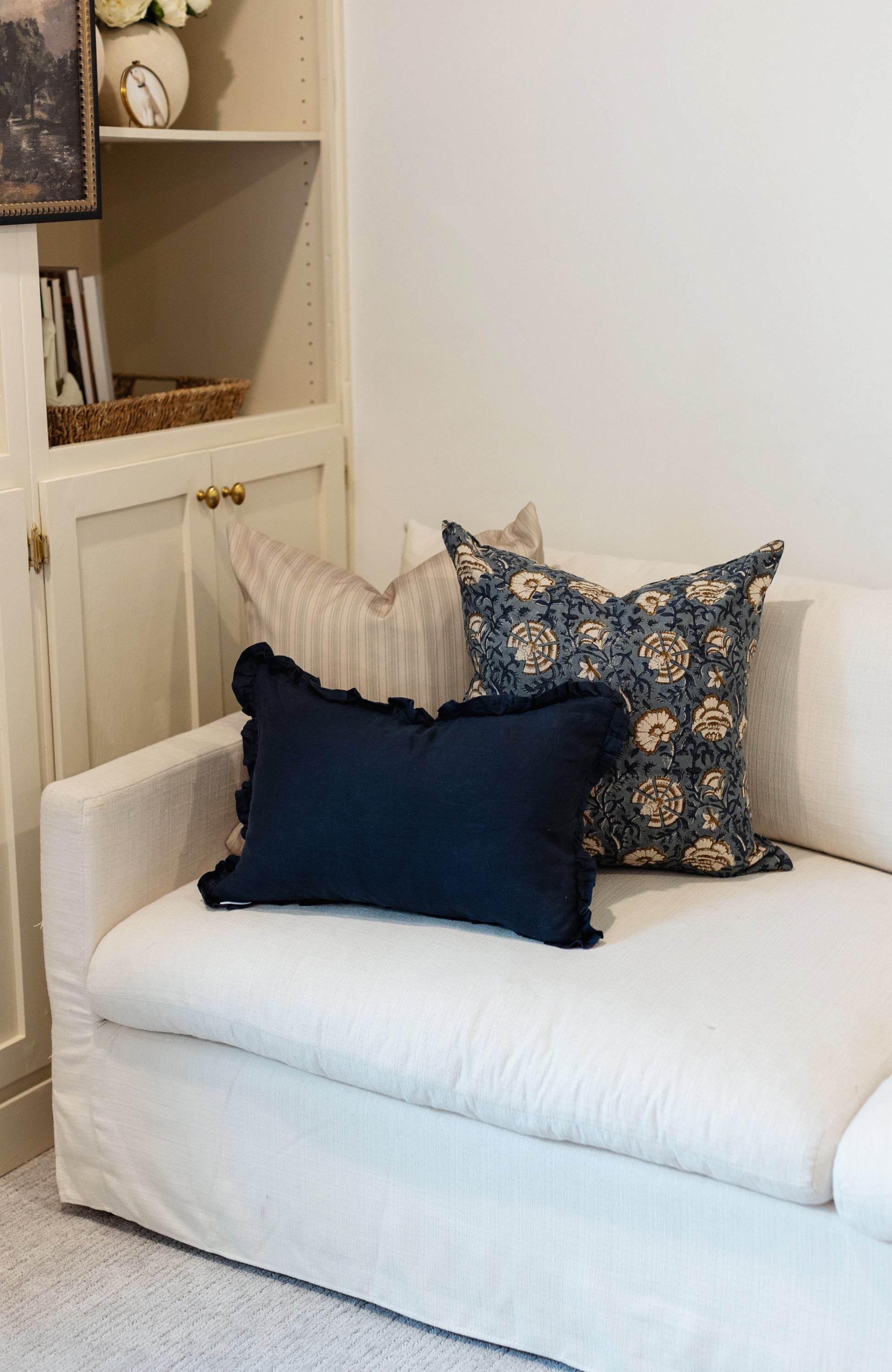 Hand block printed in India, the Cadiz pillow showcases a dusty blue floral pattern with white and brown details. Each one has unique character and timeless appeal. Double-sided pattern.