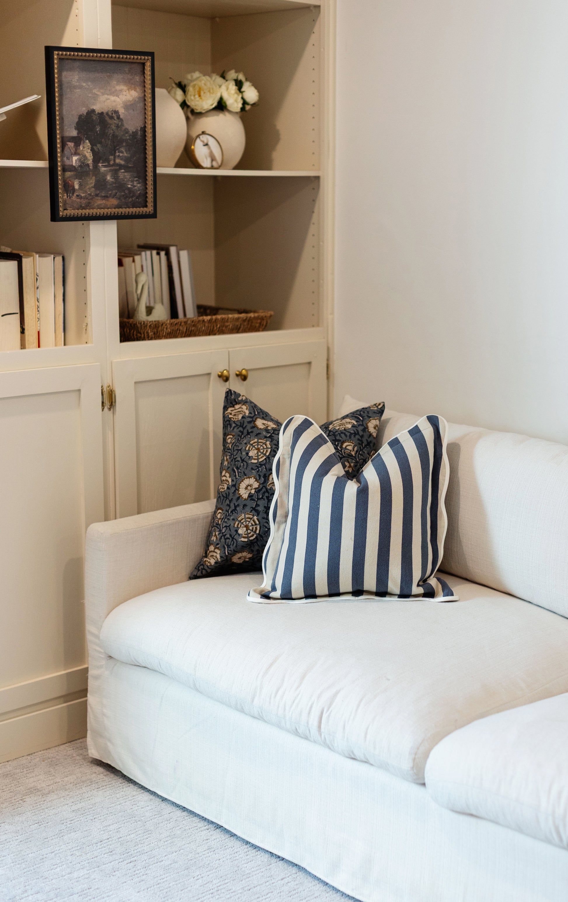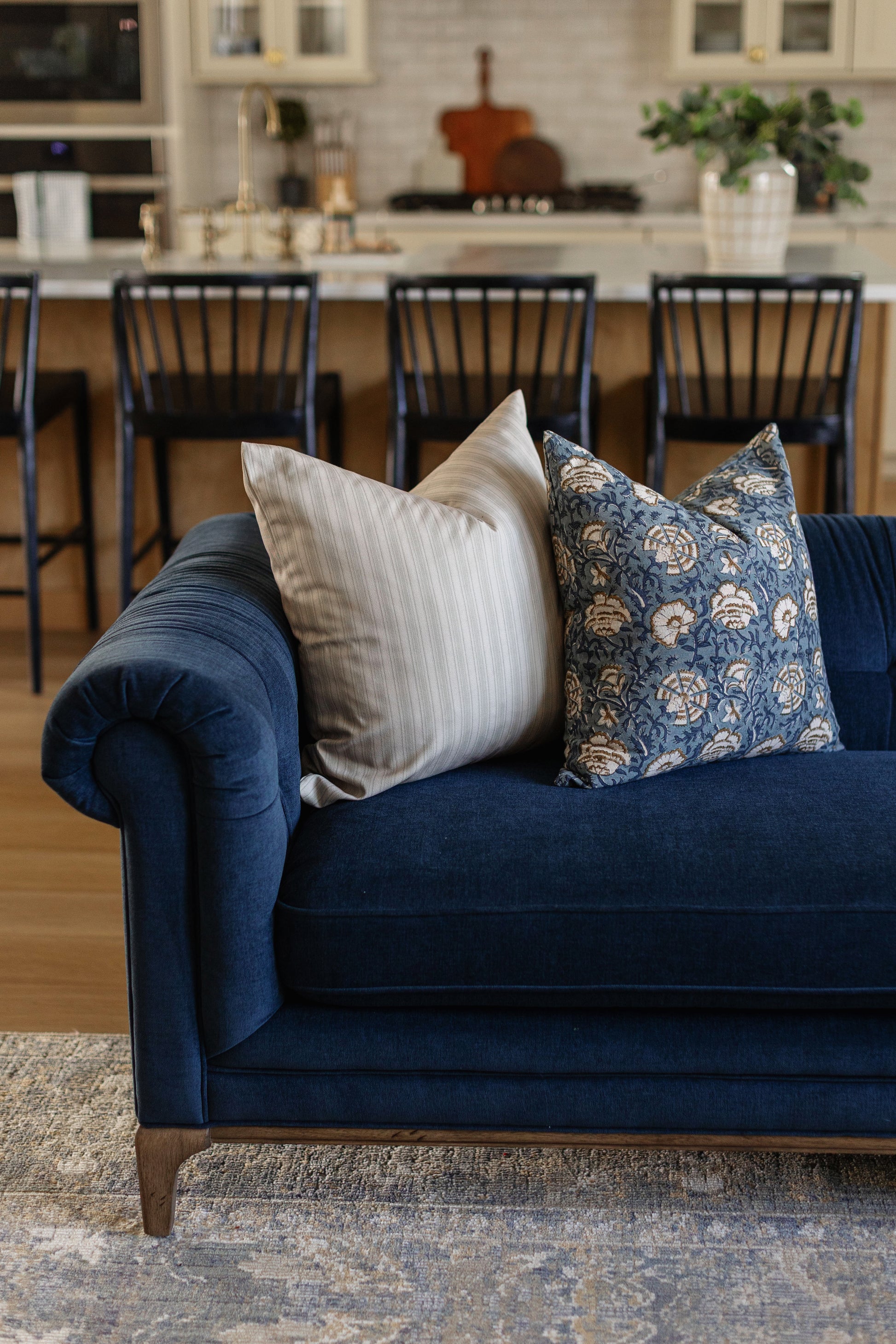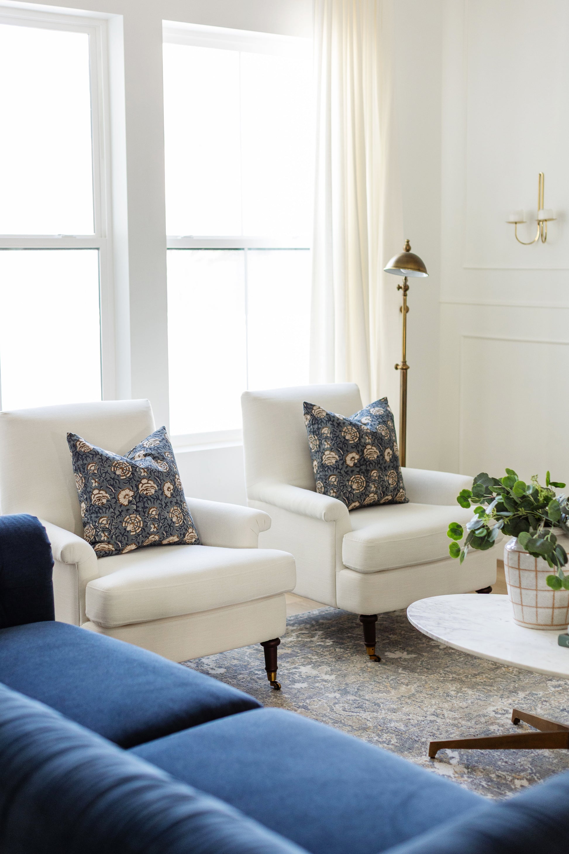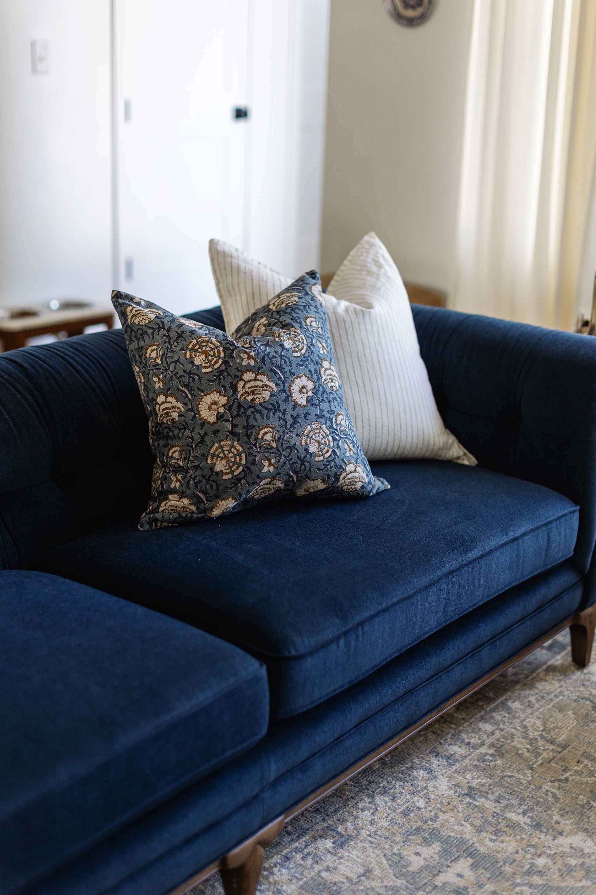 Hand block printed in India, the Cadiz pillow showcases a dusty blue floral pattern with white and brown details. Each one has unique character and timeless appeal. Double-sided pattern.