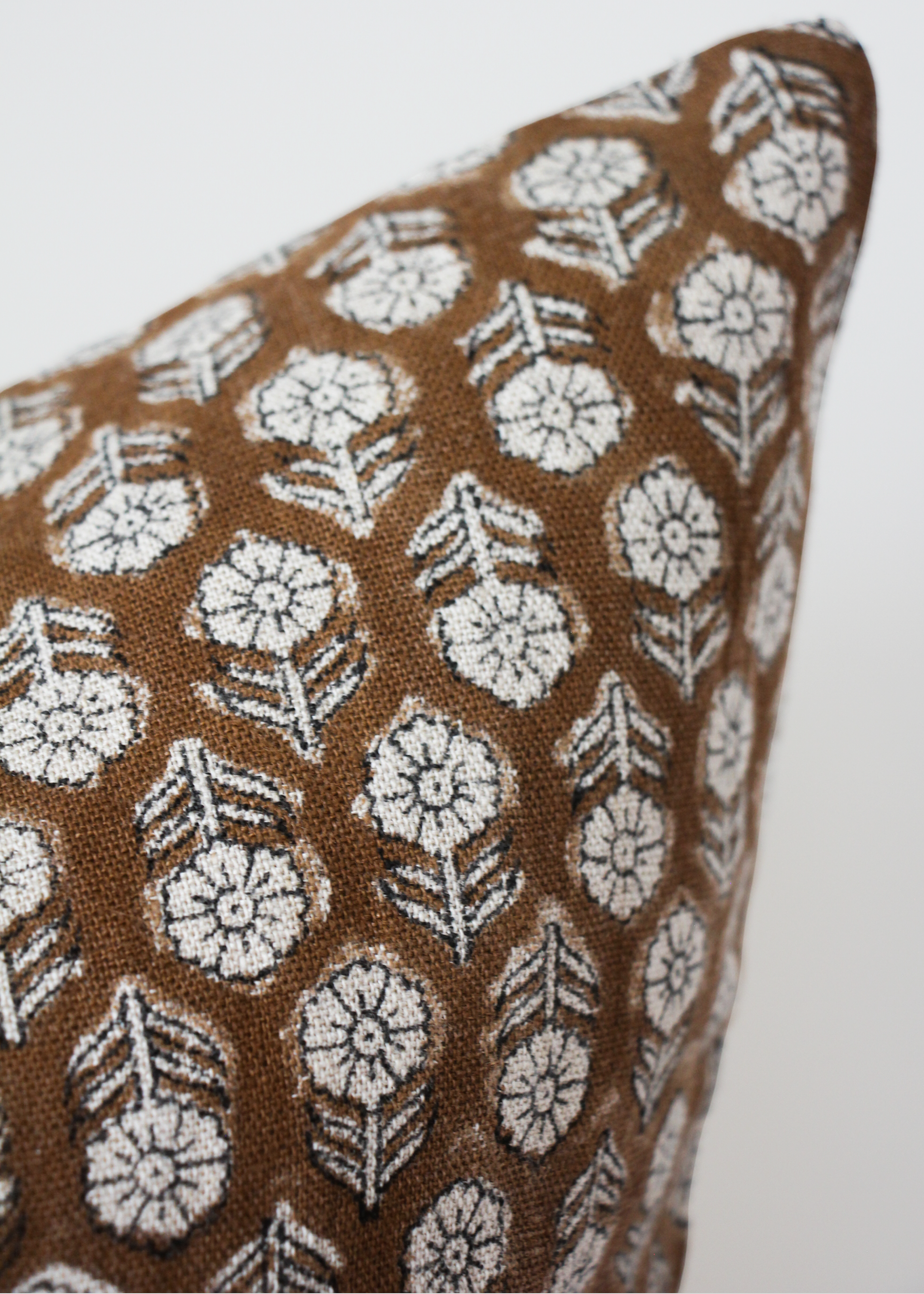 The Cognac lumbar pillow features a golden brown hue, reminiscent of a perfectly toasted marshmallow, with hand-block printed florals on one side. Crafted in India, its warm, inviting color and unique pattern make it cozy and stylish.