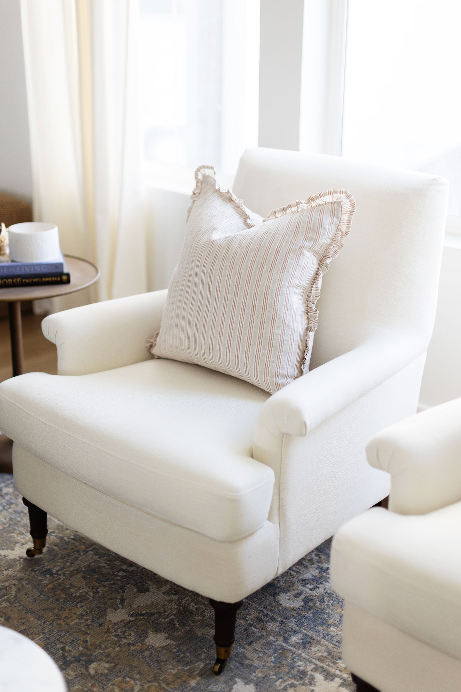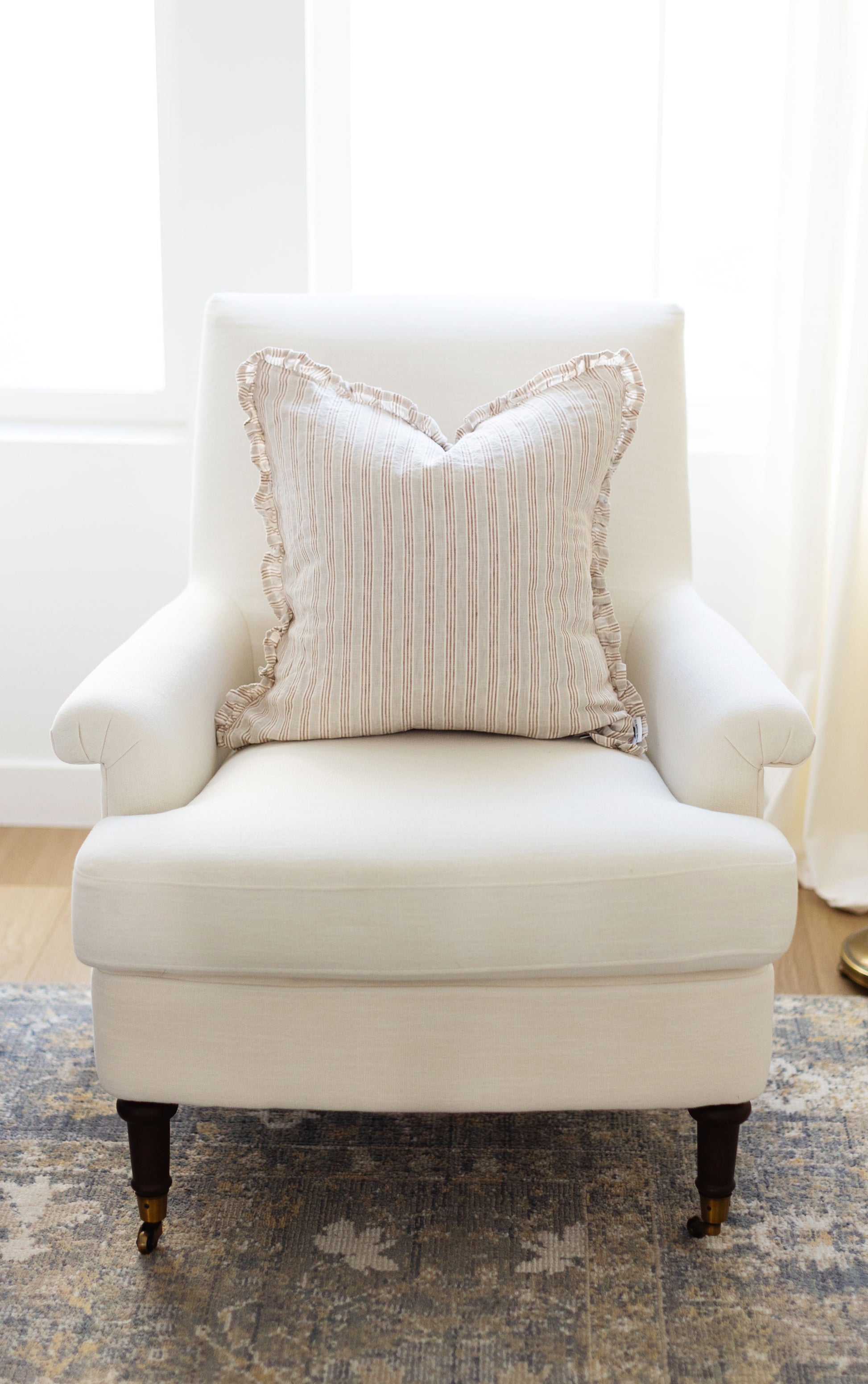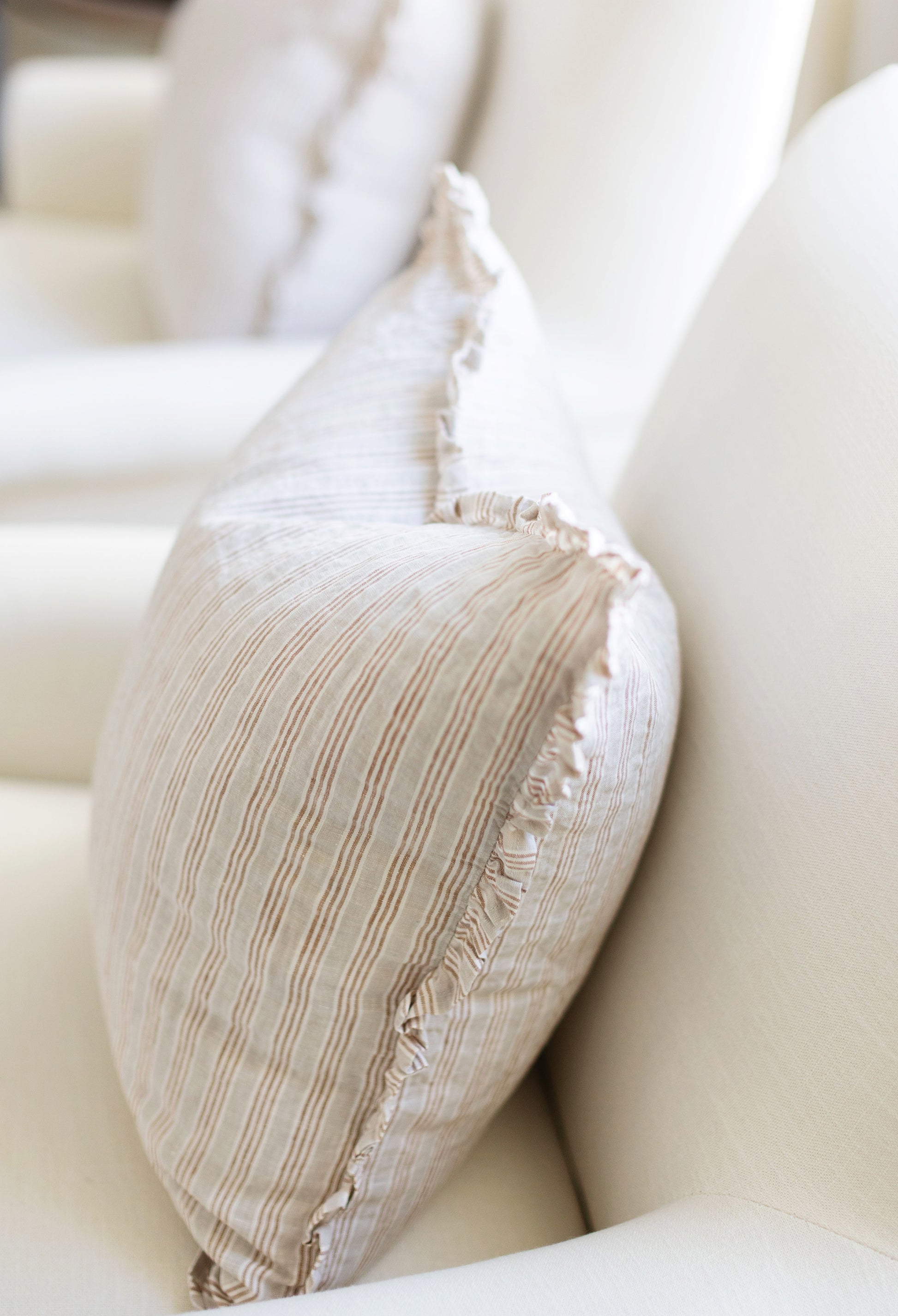 Refined but cozy at heart, this pillow features natural linen and cream color with deep tan stripes. It’s crafted with linen material, giving it both texture and durability. The ruffled edge adds structure and makes it style beautifully. At 20x20 inches, it’s perfectly sized for layering with other pillows or anchoring a space on its own. Designed to feel curated, comfortable, and completely put together.