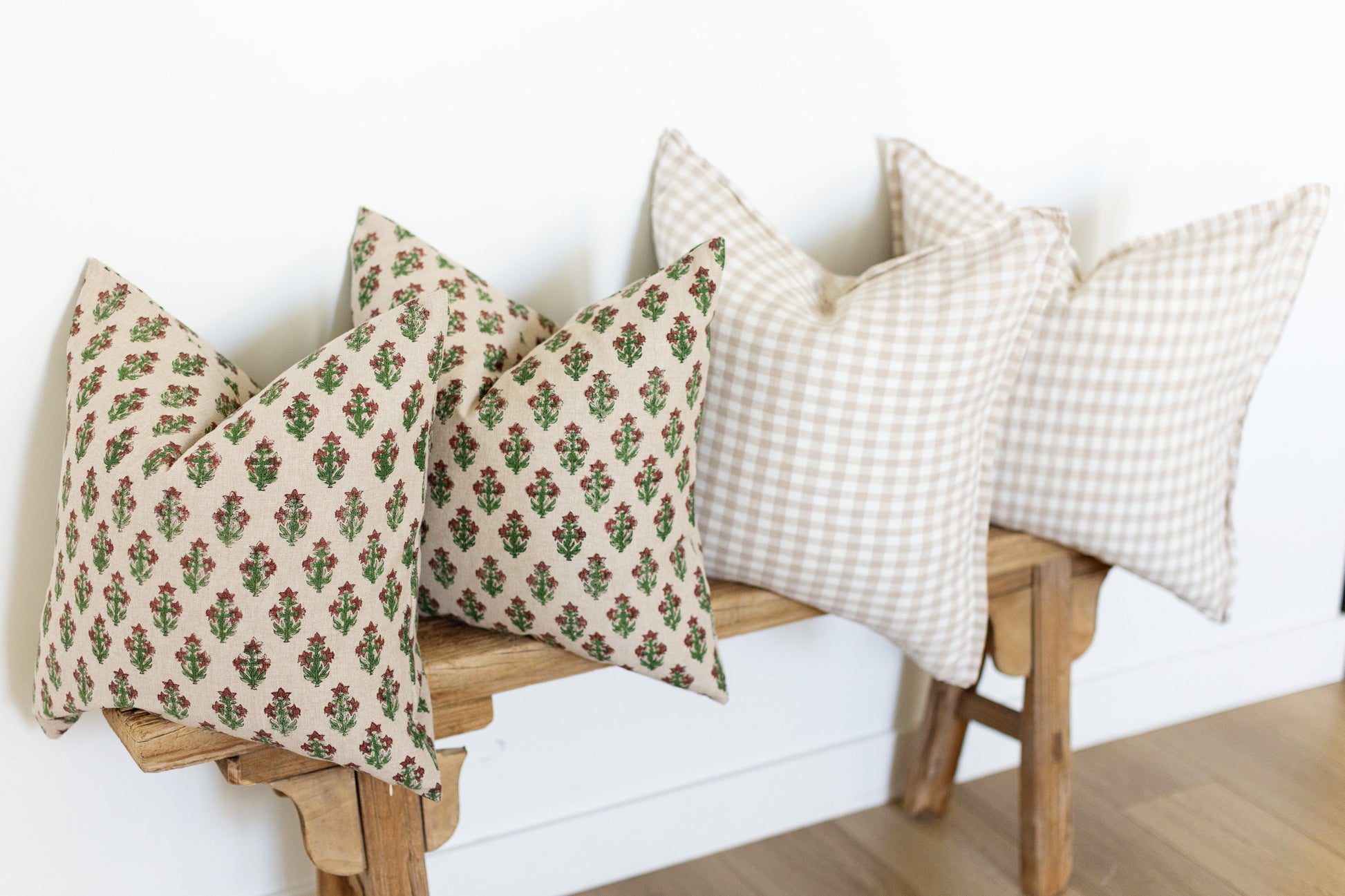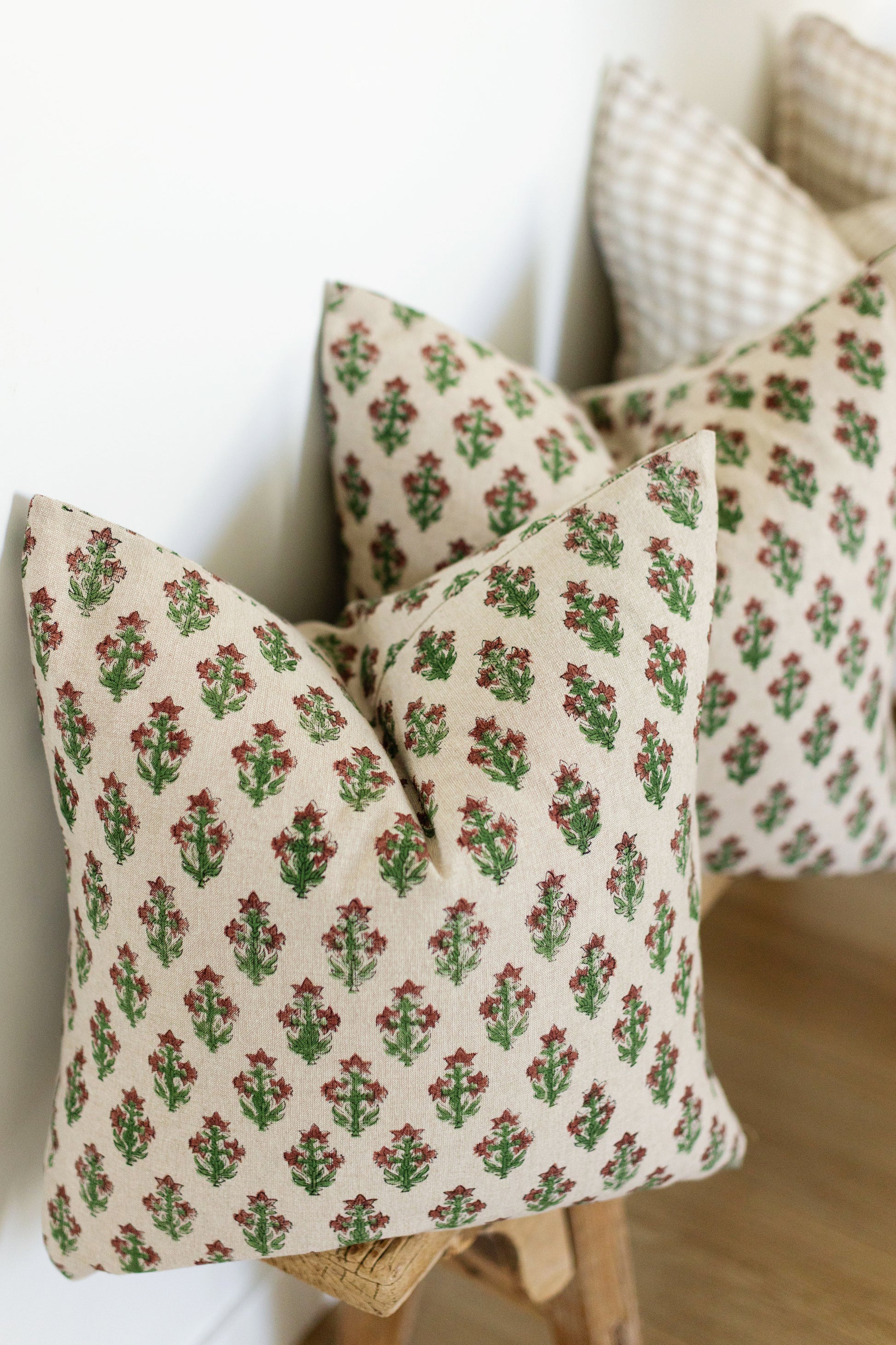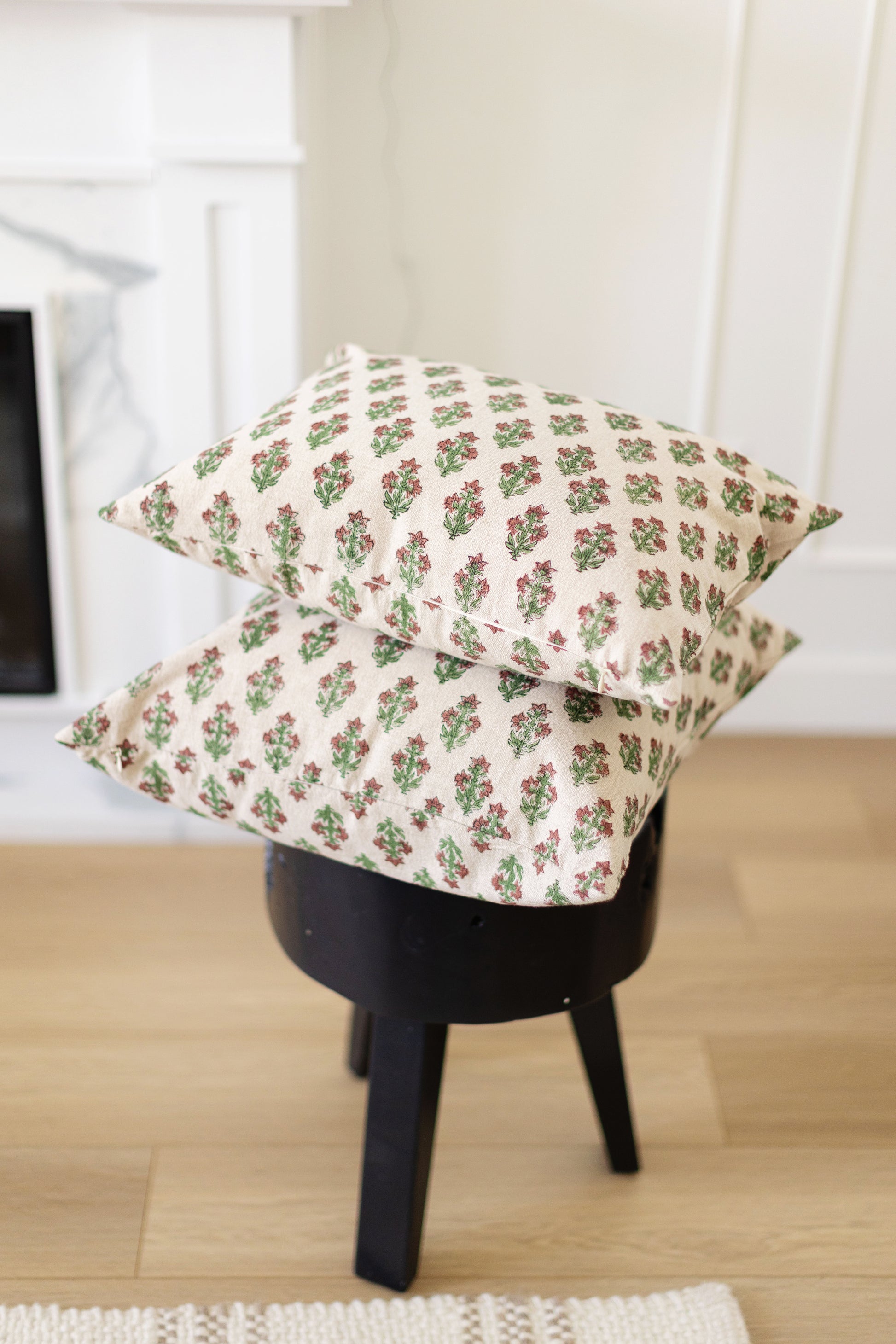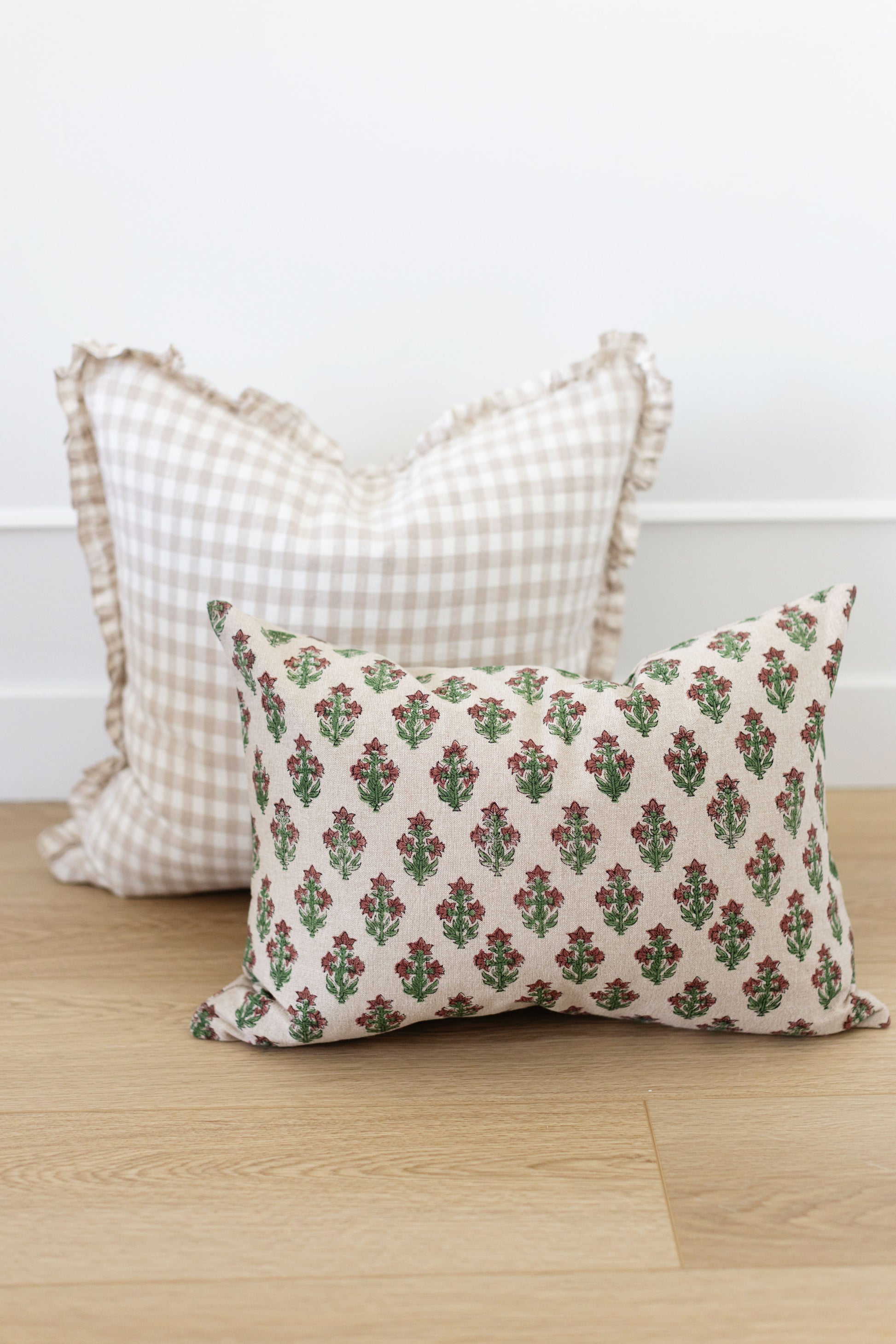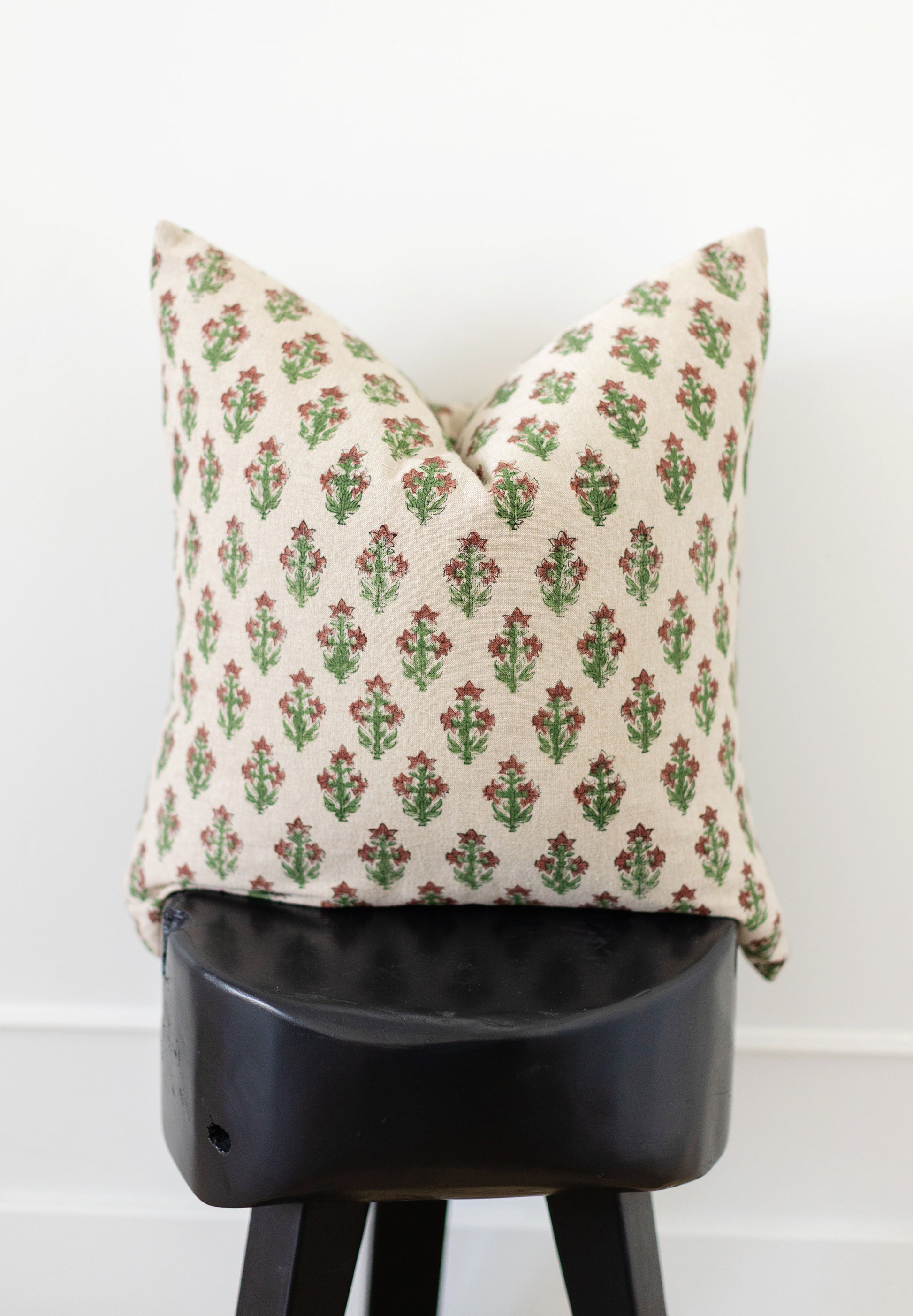The Malaga pillow features a natural linen base with a soft mauve undertone, accented by greenery and berry-toned florals in deep pink and purple hues. Hand block printed in India, it brings a unique, artisanal touch to any space. Double-sided pattern.