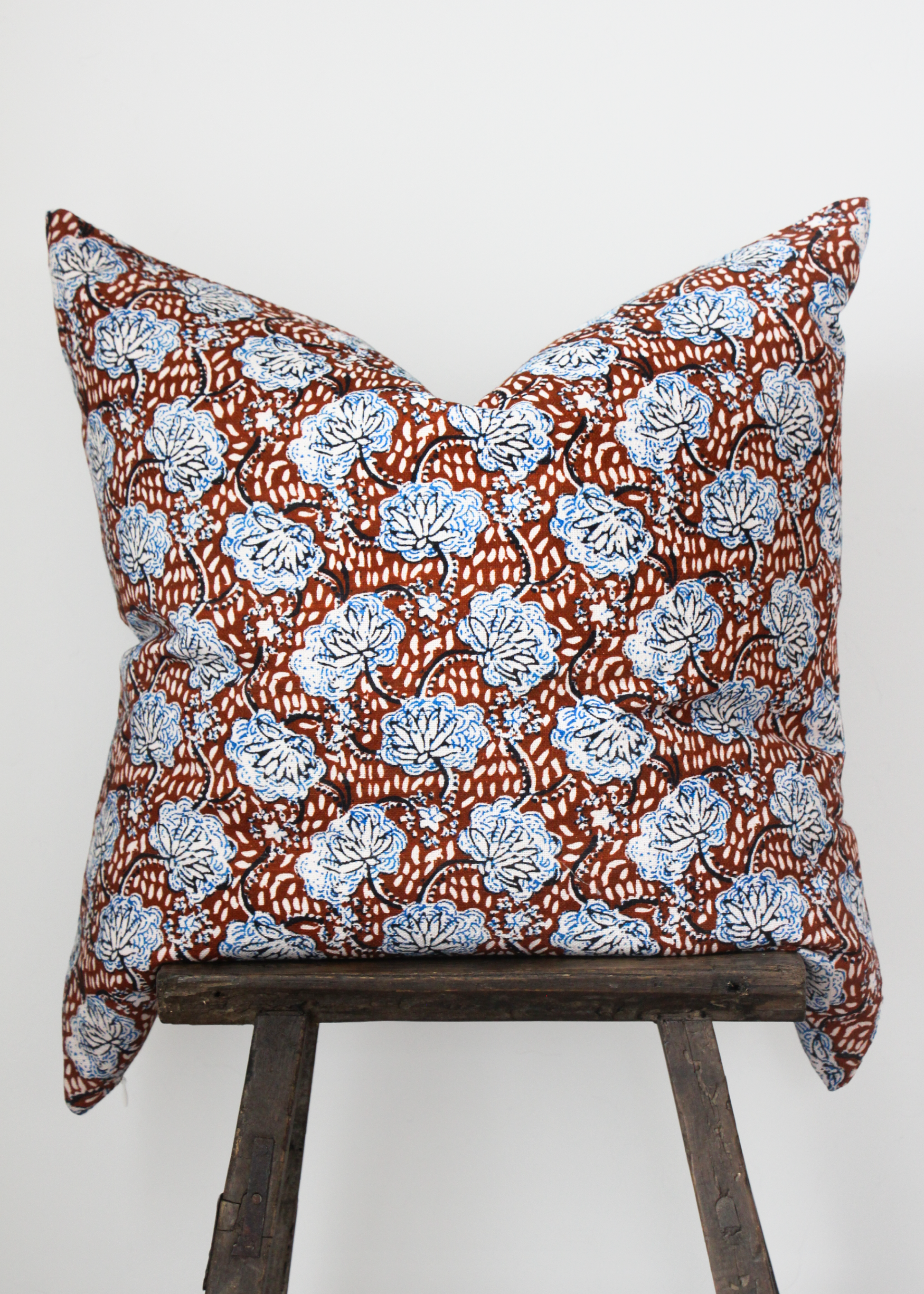 The Marseille pillow features a vibrant red base with bold blue flowers, creating a fun and unique style. Its striking colors and playful design make it a statement piece in any space.