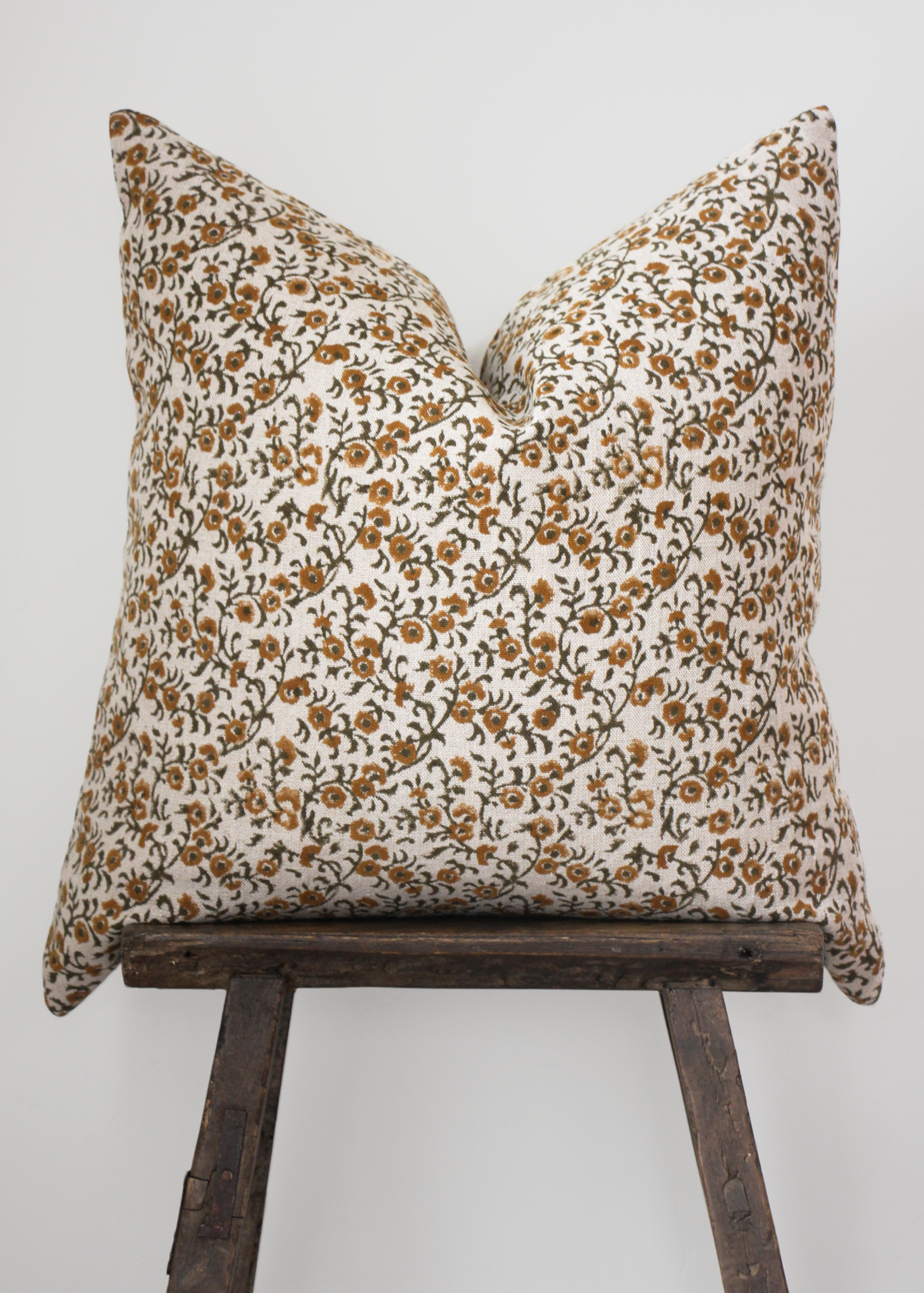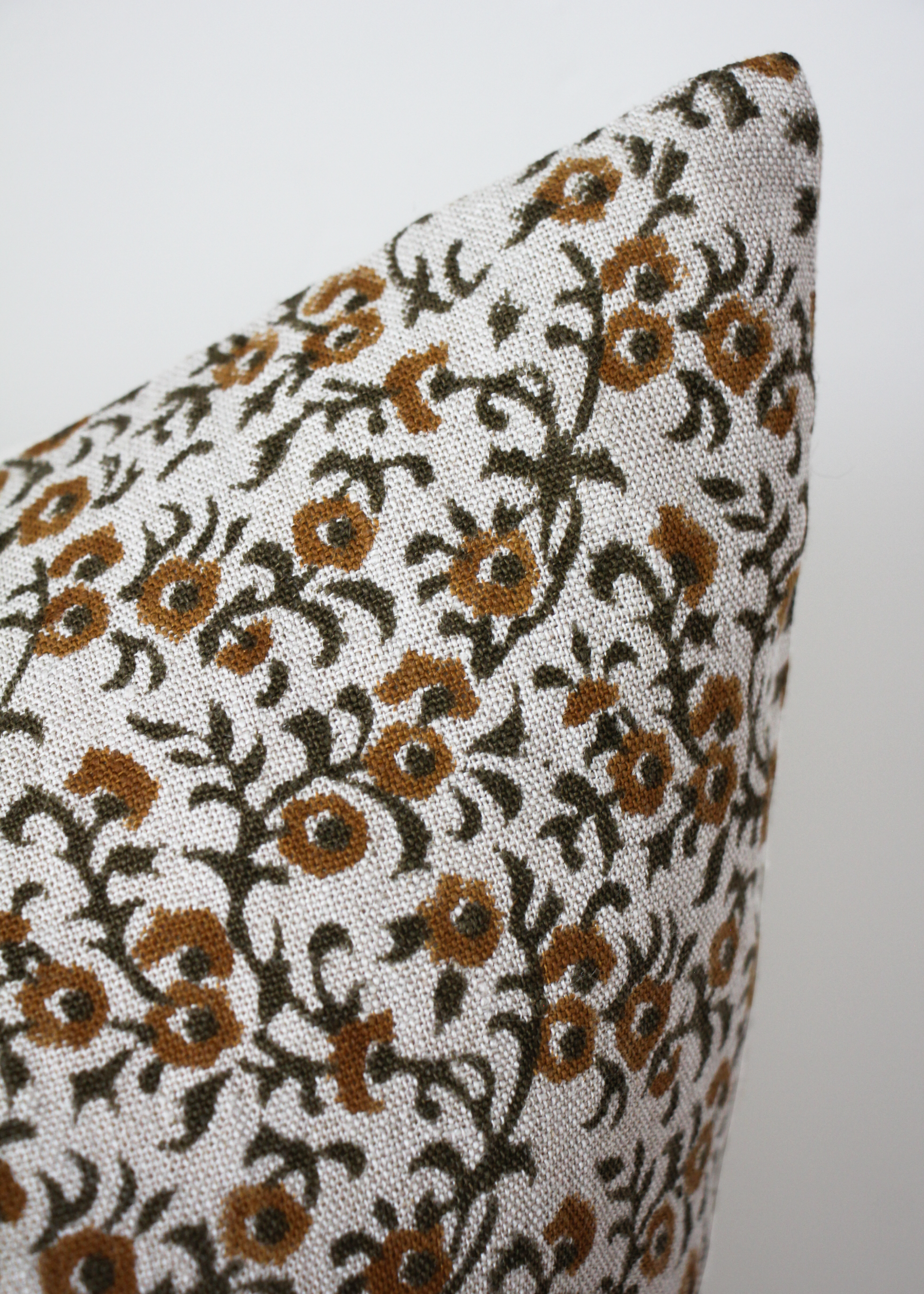 This pillow features a beige linen base with olive green leaves and dainty golden yellow flowers, hand-block printed on one side. Its soft, natural tones bring a warm, subtle charm to any space