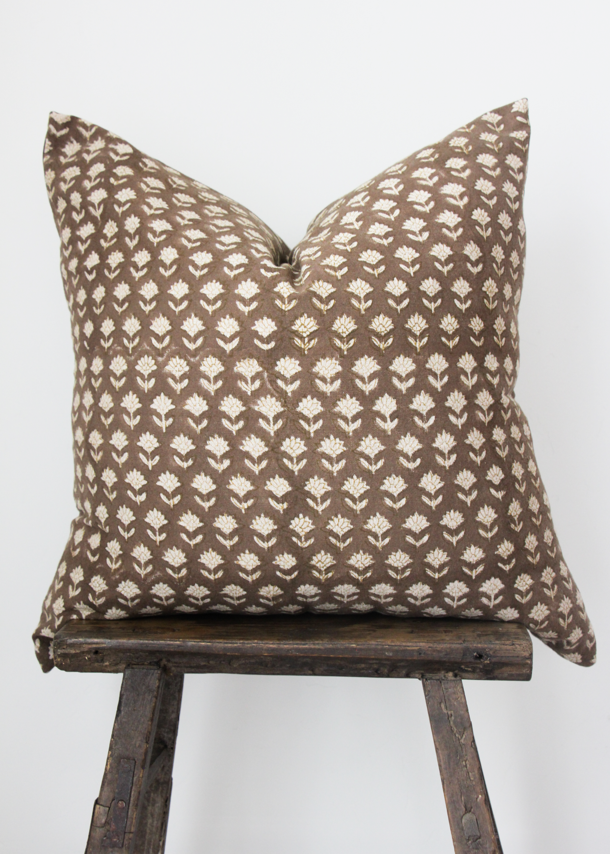 The Windsor pillow features a rich dark brown base with delicate cream blockprinted flowers. Its elegant design adds a touch of sophistication while maintaining a timeless, versatile style.